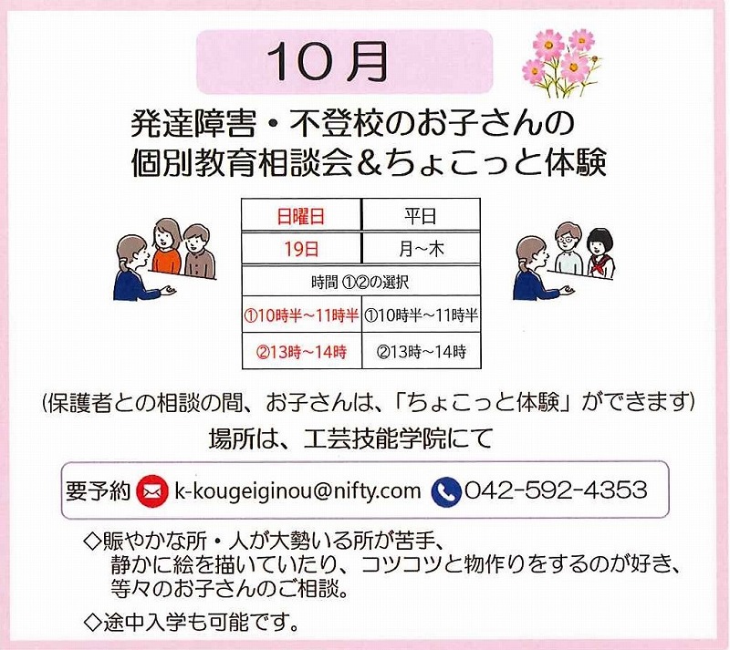 2025年10月1日 / 最終更新日時 : 2025年10月7日 工芸技能学院 / 発達障害・不登校の学校 (東京都日野市) 教育相談会 10月・発達障害・不登校のお子さんの個別教育相談会 10月の発達障害・不登校のお子さんの個別教育相談会は、下記のとおりです。 (小中学生の現況のご相談のみならず、中学卒業後・高校卒業後のご相談も多数あります。) お気軽にお問い合わせ下さい。 (発達障害・不登校の子どもたちに笑顔と生きる希望を!) ★火曜日と金曜日の実施は停止しております。(通学生徒多数のため) 平日の実施は(月)(水)(木) ▼ 以下の日時は予約済みです。 ×6日(月) ➀10時半~11時半 ×8日(水) ➀10時半~11時半 ×30日(木) ➀10時半~11時半